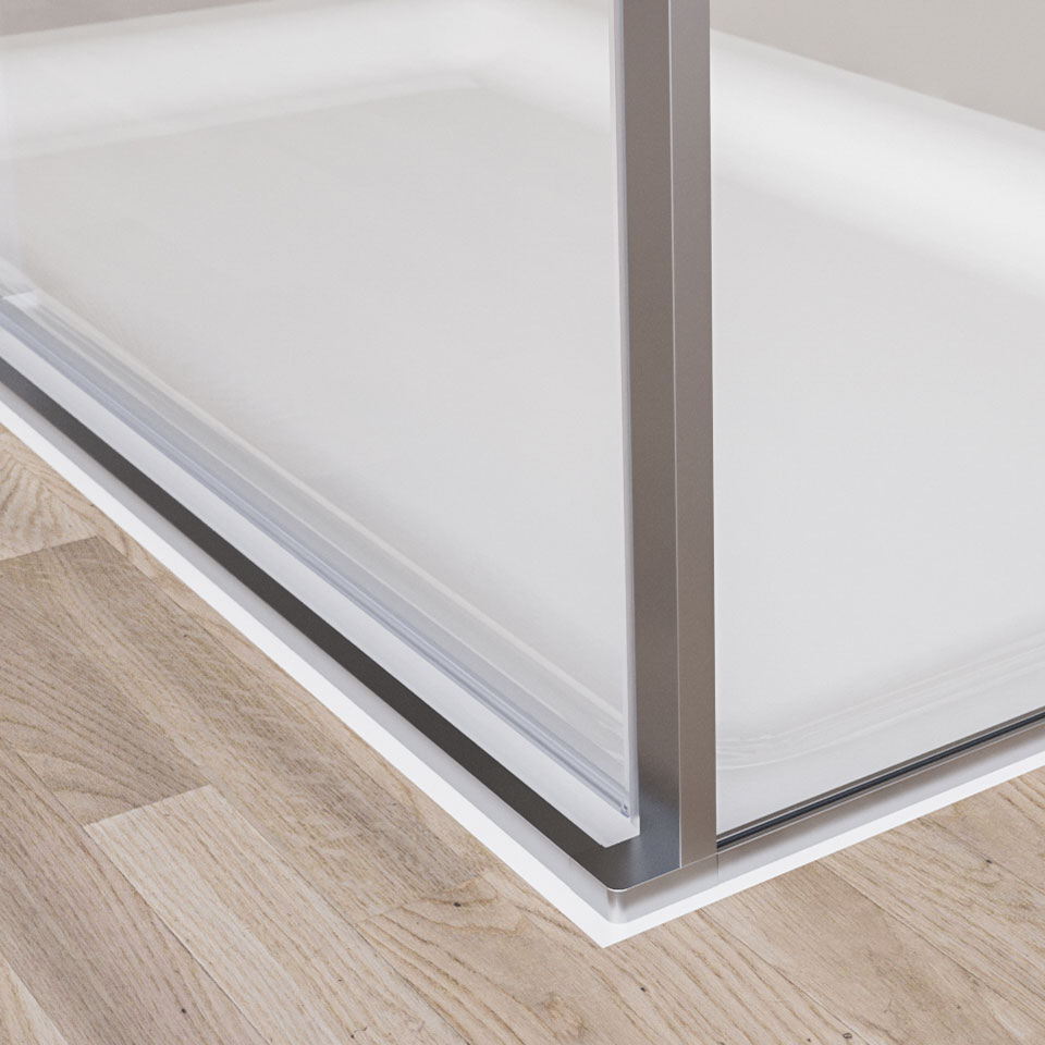 De Riga douchewand kenmerkt zich door de mooie aansluiting van de bovenprofielen, die in een hoek van 45 graden met elkaar zijn verbonden. De zijwand met rondom profiel heeft dezelfde glasdikte als de deur. De scharnieren zijn gemaakt van hoogwaardig metaal en zijn stevig en betrouwbaar.